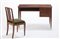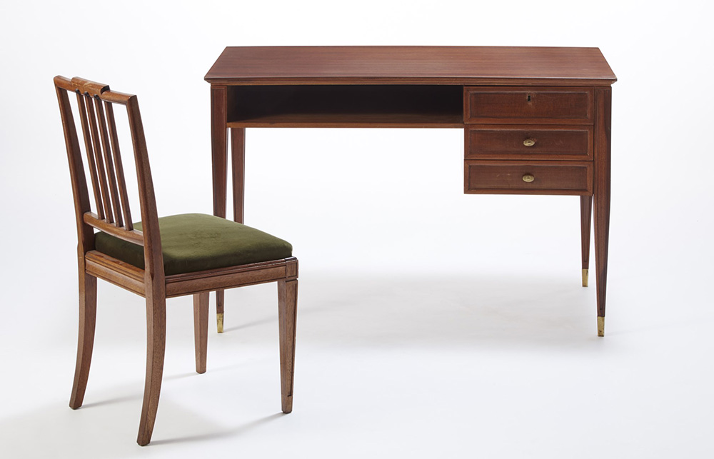Scrivania a due cassetti in legno di noce massello e impiallacciato. Gambe rastremate e puntali in ottone. Unita a sedia di analogo disegno. Esecuzione italiana, sec XX (cm 118,5x 77x 60; sedia cm 44x88x52) (difetti)
