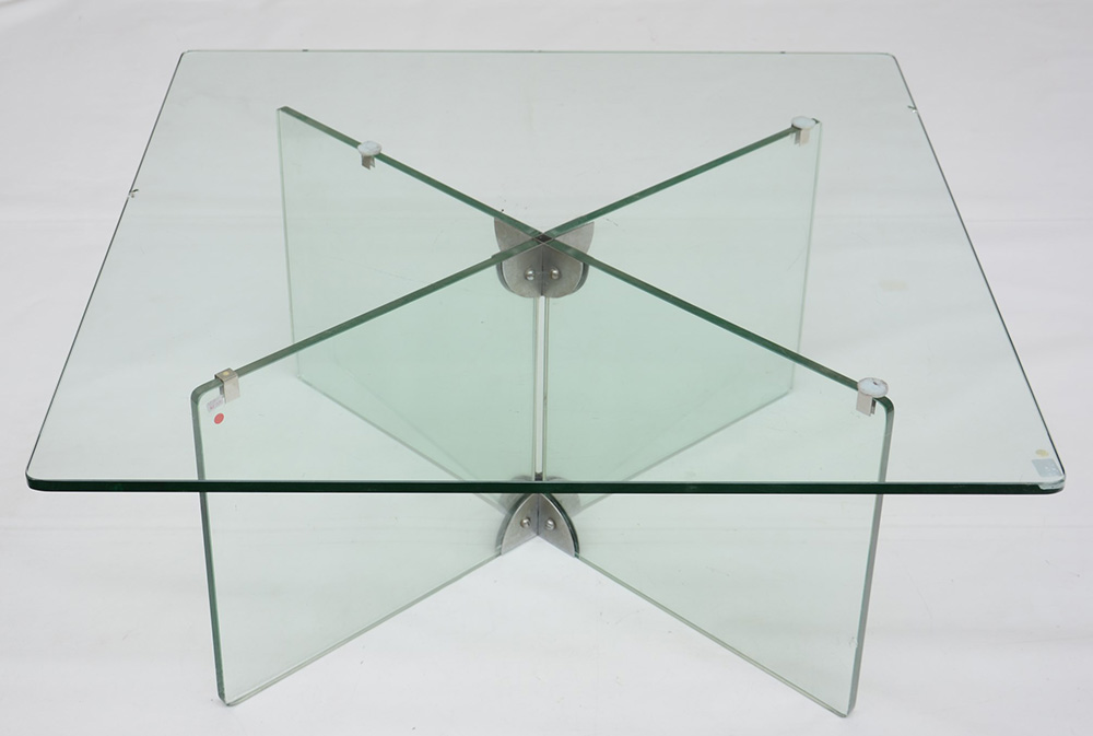 Gallotti e Radice (attribuito) Tavolino da salotto con struttura e piano quadrato in cristallo molato trasparente verdino e guarnizioni in acciaio. Milano anni 70 (cm 81x36x81) (difetti)