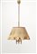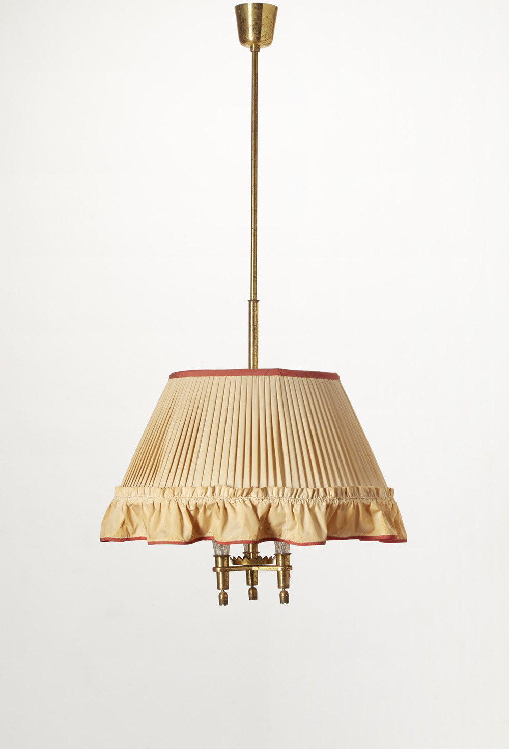 Strada (attr.) Lampadario a tre fiamme con struttura in ottone e portacandele in vetro zigrinato, paralume in tessuto. Milano anni 40 (h cm 130, d cm 60) (lievi difetti e mancanze)