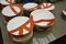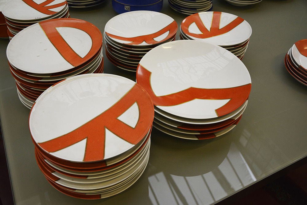 Manifattura di Heinrich. Servizio di piatti composta da: trentasette piatti piani, sedici piatti fondi, sedici piattini, due ciotole, cinque piatti da portata e cinque vassoi in porcellana bianca decorata a mano in arancio e oro a iniziali. Disegno dell'arch: Francesco Carmine