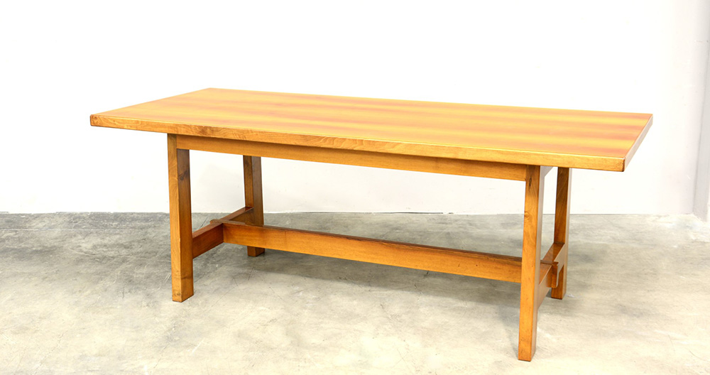 Tavolo da pranzo impiallacciato e lastronato in legno di noce con gambe e traverse squadrate. Italia, sec XX (cm 220x84x74) (lievi difetti)