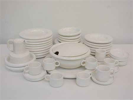 Manifattura Gabbianelli. Servizio in ceramica bianca composto da: un piatto da portata, una zuppiera con coperchio, sei piatti fondi, dodici piatti piani, sei ciotole, una caffettiera con coperchio, sei tazze da caffÈ, una lattiera, una zuccheriera, otto piattini, due piattini sotto tazza. Italia, anni 70 (difetti e restauri)