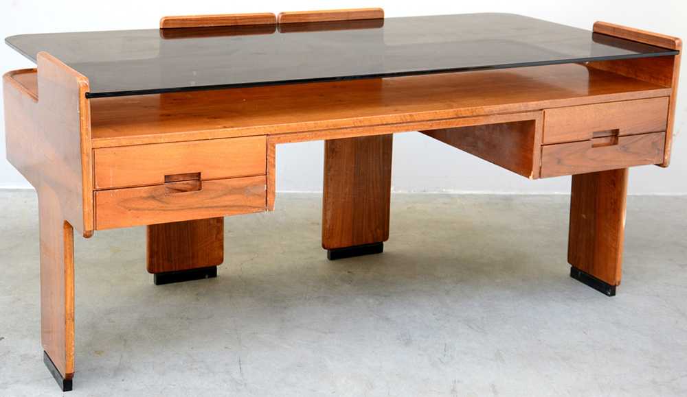Scrivania da centro di gusto Neoliberty con due cassetti in linea per lato, sostegni sagomati e piano in vetro fumË. Formella decorativa sul fronte raffigurante fiore dipinto a mano in verde e oro. Italia, anni 60/70 (cm 160x78x79) (difetti)