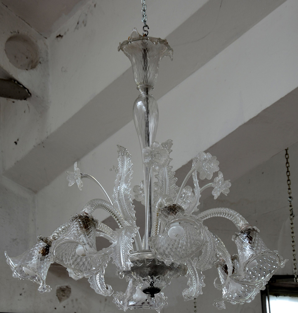 Manifattura di Murano Lampadario in vetro incolore a sei luci decorato a motivi vegetali e floreali. Italia, seconda met‡ del sec XX (h cm 90) (difetti e mancanze)