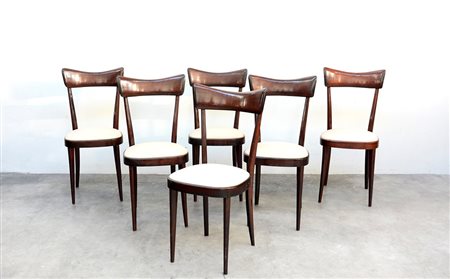 Lotto composto da sei sedie con schienali ricurvi rivestite in skai bianco. Sec XX (difetti)