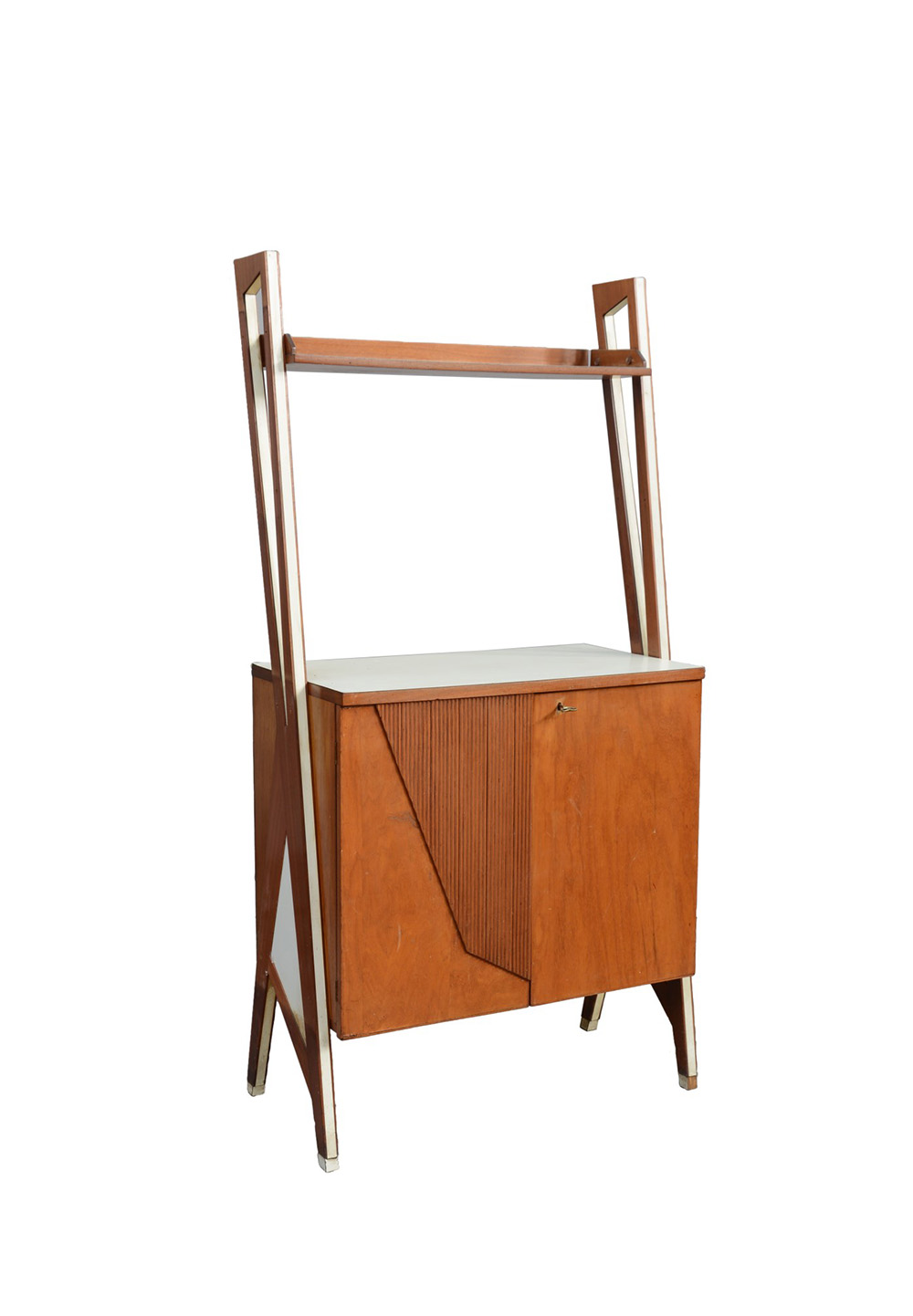 Mobile stipo a due ante con struttura a cavalletto e ripiano porta libri impiallacciato in legno e laminato bianco. Italia, fine anni 60 (cm 86x171x45) (difetti)
