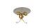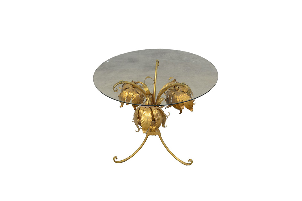 Lampada tavolino a tre luci in metallo dorato con piano circolare in vetro. Italia, sec XX (h cm 58) (difetti)