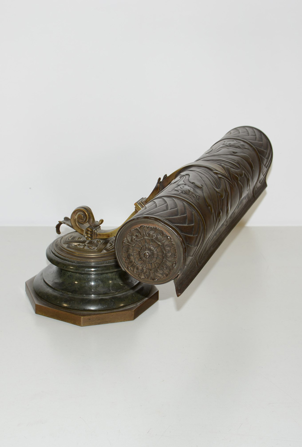 Lampada da tavolo con struttura in rame e bronzo, basamento in marmo verde, paralume a rullo con decori a sbalzo. Sec XX (h cm 19) (lievi difetti)