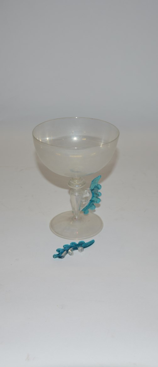 Coppa biansata in vetro opalescente con anse decorate a riccioli (h cm 18)...