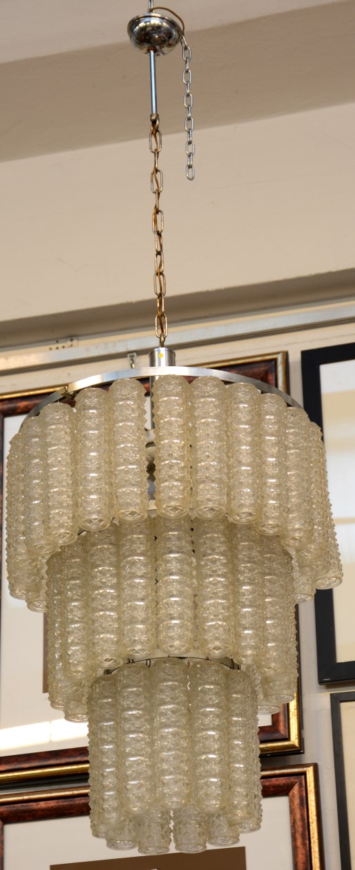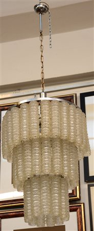 Lampadario con struttura in metallo cromato e pendenti cilindrici in vetro stampato bugnato su tre ordini. Italia, anni 70 (difetti e modifiche)