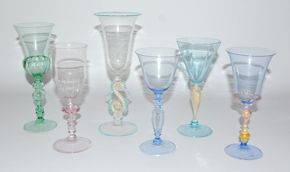 Manifattura di Murano, lotto di sei calici in vetro colorato (lievi difetti)