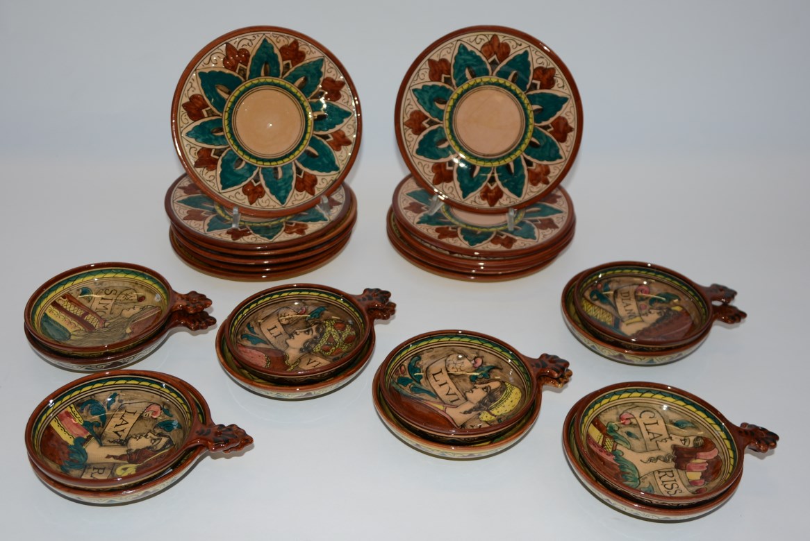 Manifattura C.A.M. Gubbio Servizio da tavola in terracotta smaltata a motivi e figure rinascimentali. Composto da due oliere, zuppiera biansata con piatto e dodici tazze da consommË con piattini (difetti