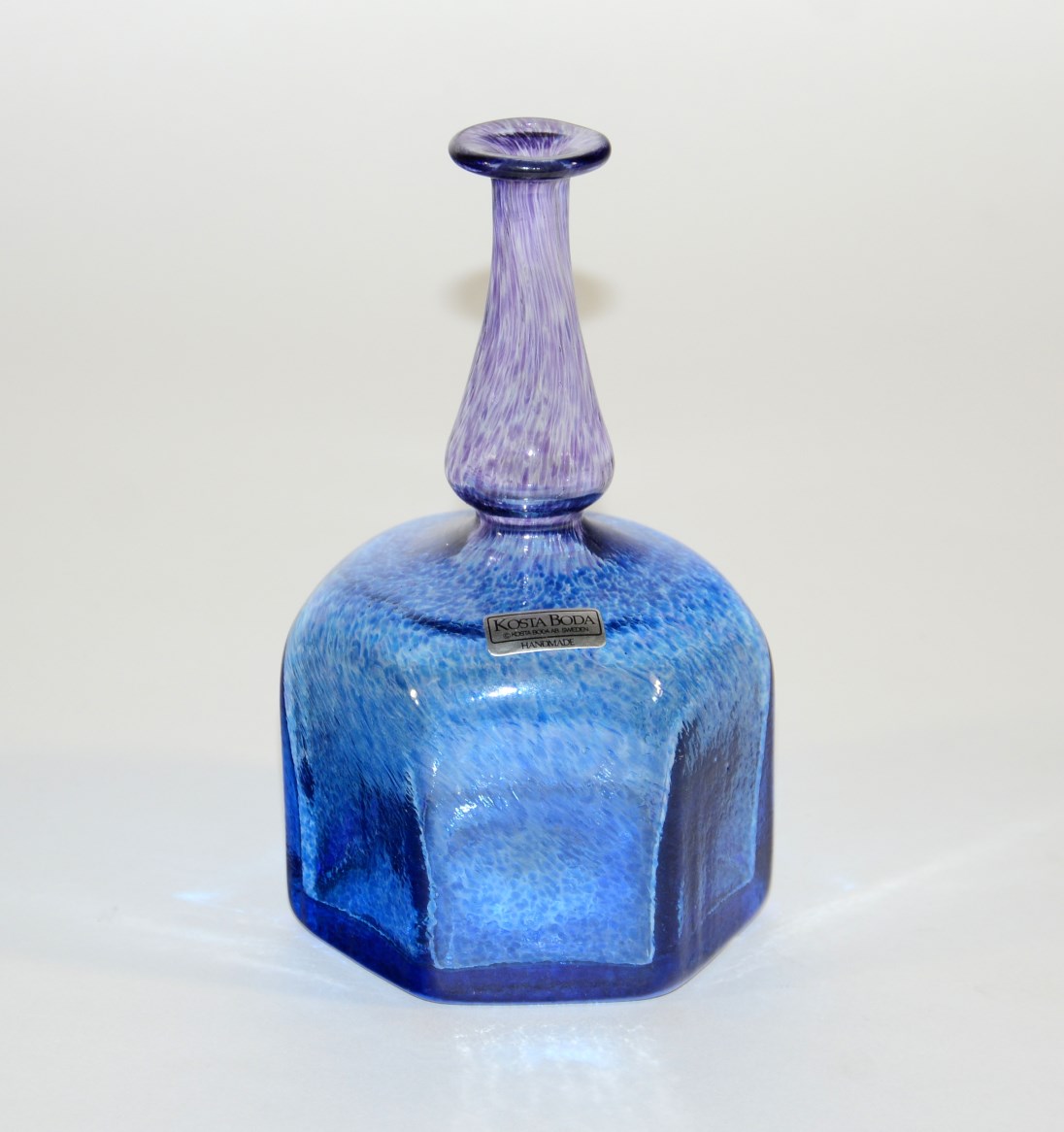 Manifattura di Kosta Boda, vaso bottiglia in vetro a macchie blu e ametista....