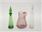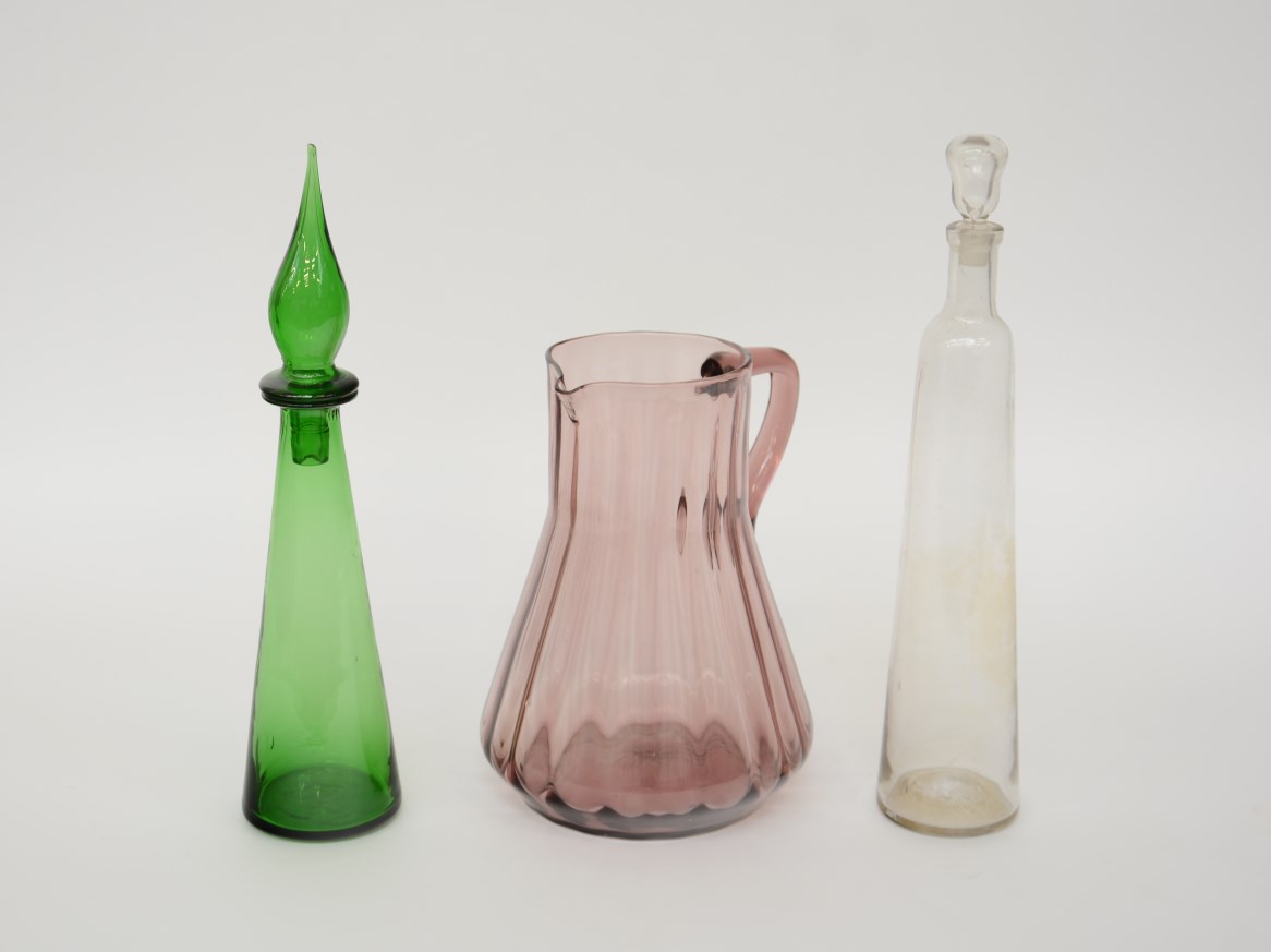 Lotto composto da una brocca in vetro costolato ametista chiaro e due bottiglie con tappo in vetro incolore e verde (h max cm 32)