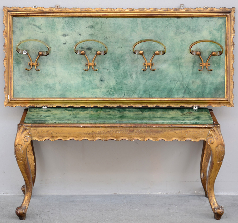 Aldo Tura (attr.) Set da vestibolo composto da un attaccapanni rettangolare a quattro grucce e una panchetta assortita con gambe mosse in legno intagliato e dorato. Seconda met‡ sec XX (cm 96x42 e 83x42x31) (difetti e modifiche)