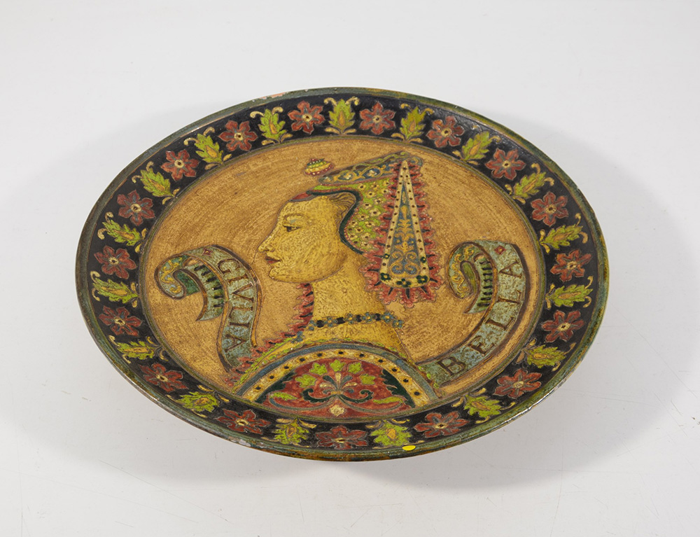 Angelino Pertici * Piatto in terracotta decorata al graffito in policromia con profilo di fanciulla alla maniera rinascimentale. Firmato "Pertici - A" sotto la base. Manifattura Milani Montopoli, sec XX (diametro cm 41) (lievi difetti)
