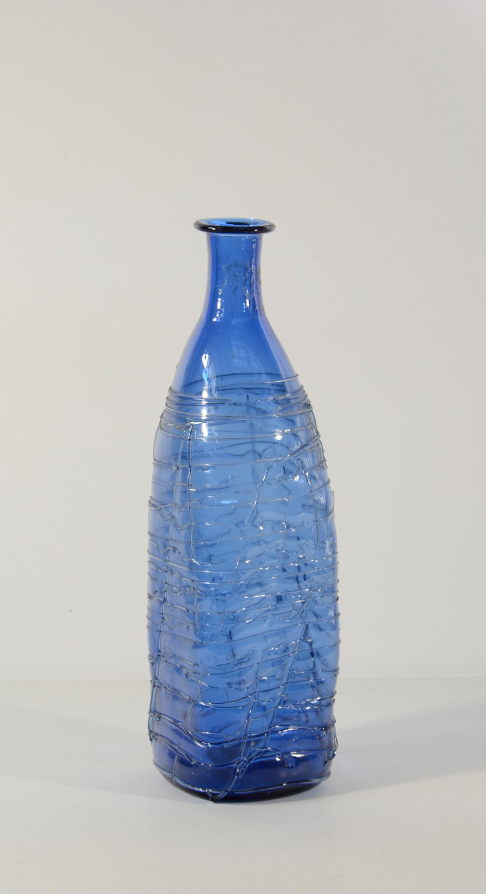 Manifattura di Murano Grande bottiglia in vetro incolore blu con applicazioni filiformi a caldo. Italia, seconda met‡ sec XX (h cm 45) (lievi difetti)