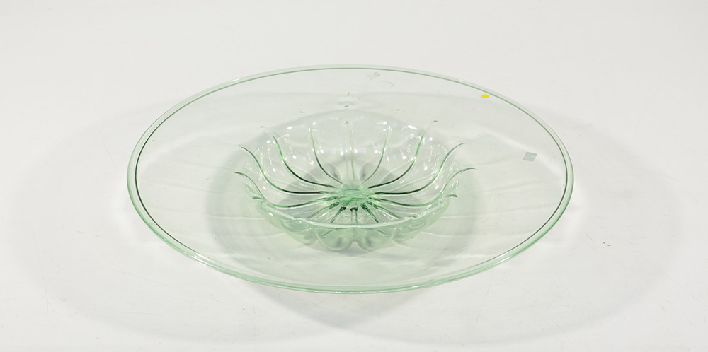 Manifattura di Murano Centrotavola in vetro soffiato verdino con base costolata. Italia, sec XX (d cm 39,5) (lievi difetti)