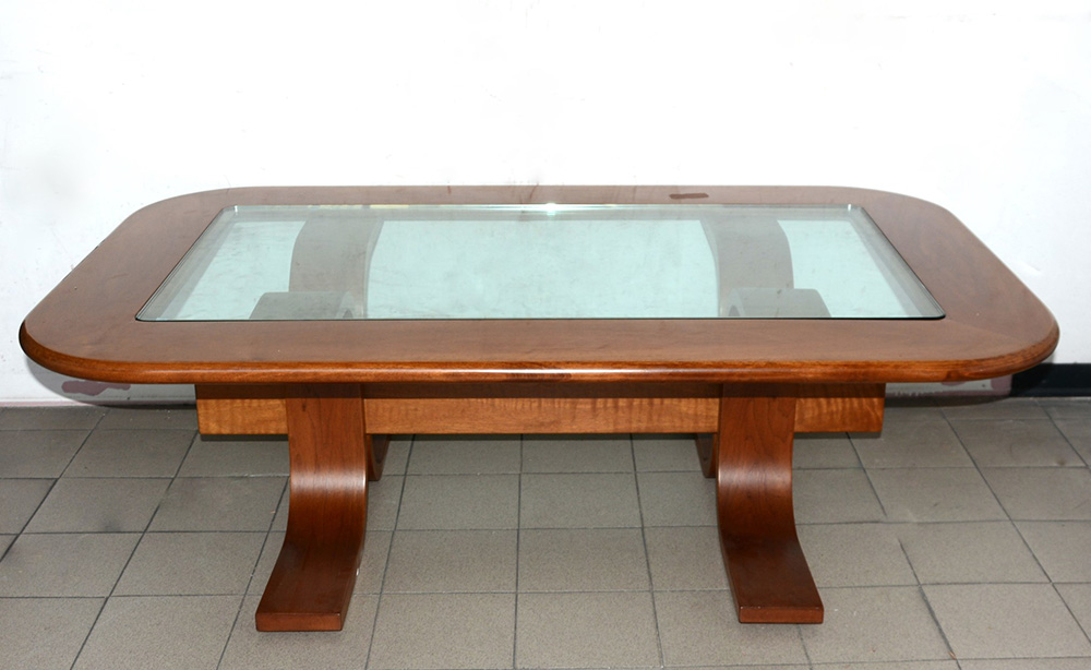 Tavolo da salotto impiallacciato in legno rettangolare con angoli smussati e piano in cristallo. Italia, fine anni 60 (cm 140x45x90) (lievi difetti)