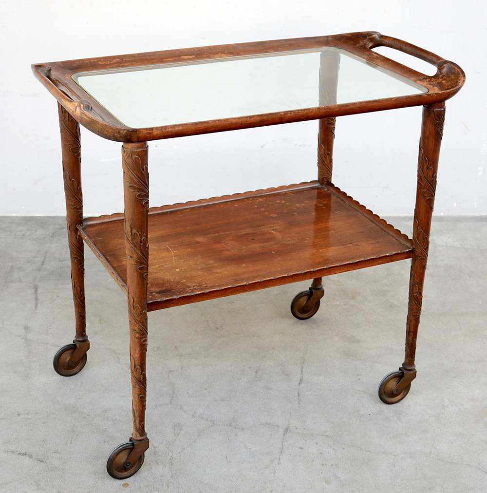 Carrellino a due ripiani con gambe intagliate a racemi e piano superiore in vetro. Italia, sec XX (cm 80x74x47,5) (difetti)