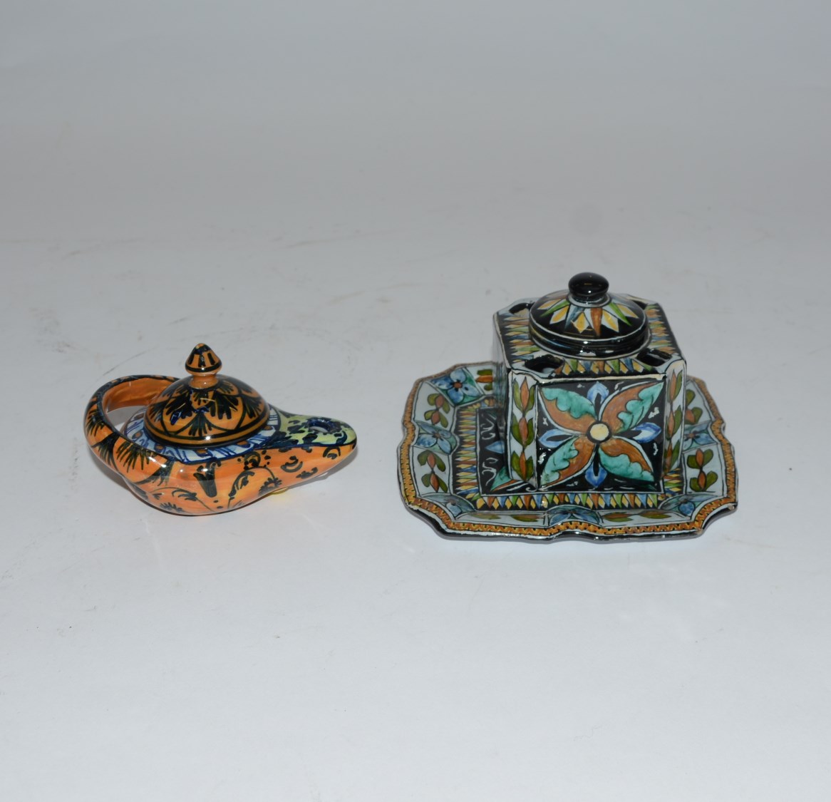 Manifattura Molaroni Pesaro. Lotto composto da una piccola lucerna e un calamaio in ceramica decorata in policromia. Sec XX (misure diverse)