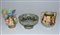 Lotto composto da una piccola anfora e un contenitore biansato in ceramica smaltata in policromia con ritratti all'antica e grottesche marcate con il monogramma della manifattura Minghetti di Bologna, unite a un'alzatina in ceramica decorata a grottesche della manifattura Molaroni Pesaro. Sec XX (misure diverse) (difetti)