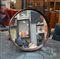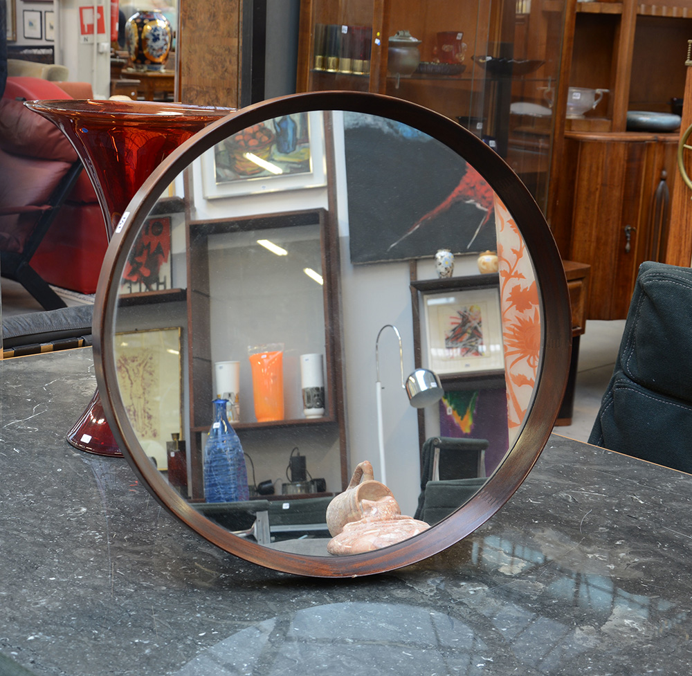 Piccola specchiera tonda con cornice in legno massello. Italia, anni 60 (d cm 51) (lievi difetti)