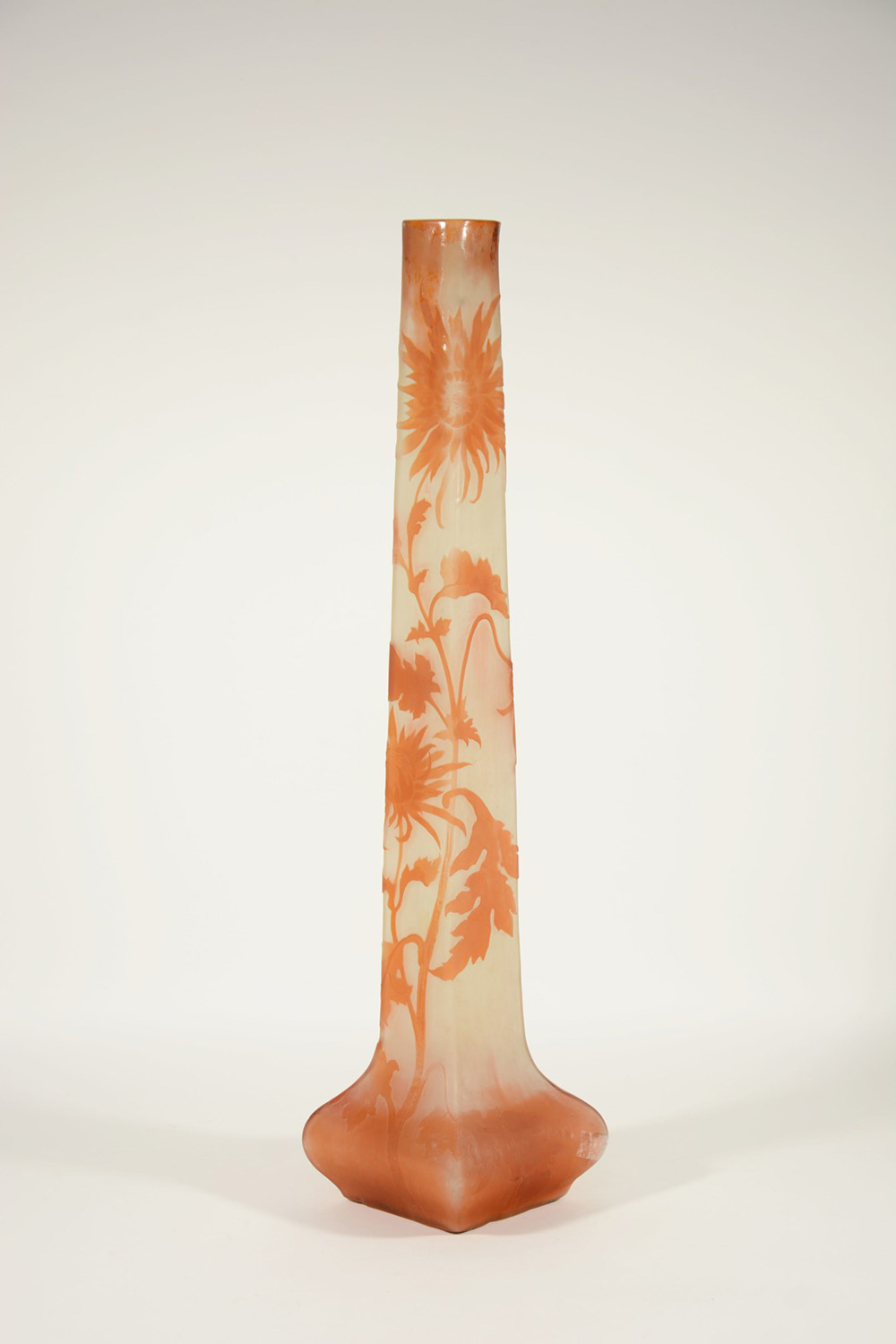 Grande vaso a collo lungo e sezione quadrata in vetro a cammeo lattescente e rosato, inciso all'acido con motivi vegetali. Recante firma a cammeo "GallÈ" (h cm 73) (difetti)