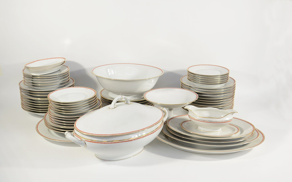 Servizio in porcellana Richard Ginori, Napoli V.S. Brigida con decoro a sottile greca rossa (23 piani, 10 fondi, 12 da frutta, 11 piccoli, 1 zuppiera, 1 alzata, 1 zuppiera con coperchio, 6 vassoi ovali, 1 salsiera, 1 piatto grande)