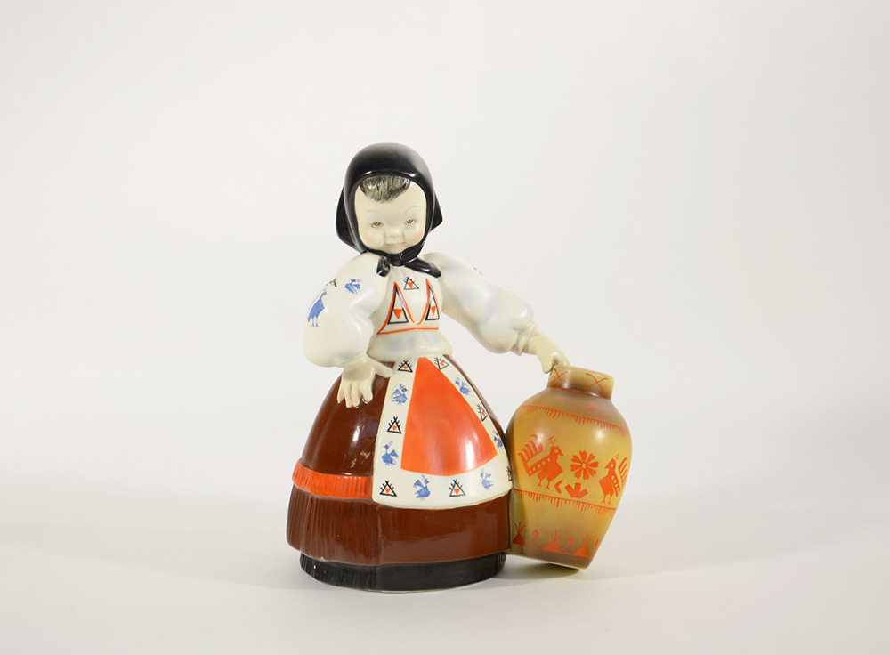 Manifattura Lenci, "Sarda con vaso", scultura in ceramica modellata a colaggio smaltata in policromia sotto vetrina. Inscritta alla base "Lenci MADE IN ITALY". Sec XX (h cm 28) (difetti) Bibliografia: A. Panzetta, Le ceramiche Lenci. Catalogo dell'archivio storico 1928-1964, Allemandi, Torino 2003, p. 283