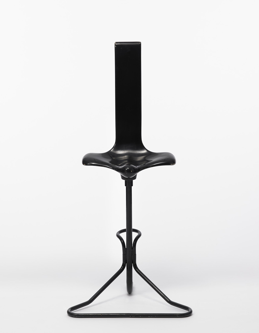 Claudio Salocchi (1934- Sgabello modello "Appoggio". Produzione Sormani, Italia anni 70. Metallo laccato nero e vetroresina nera (cm 40x120x24) (difetti)