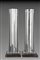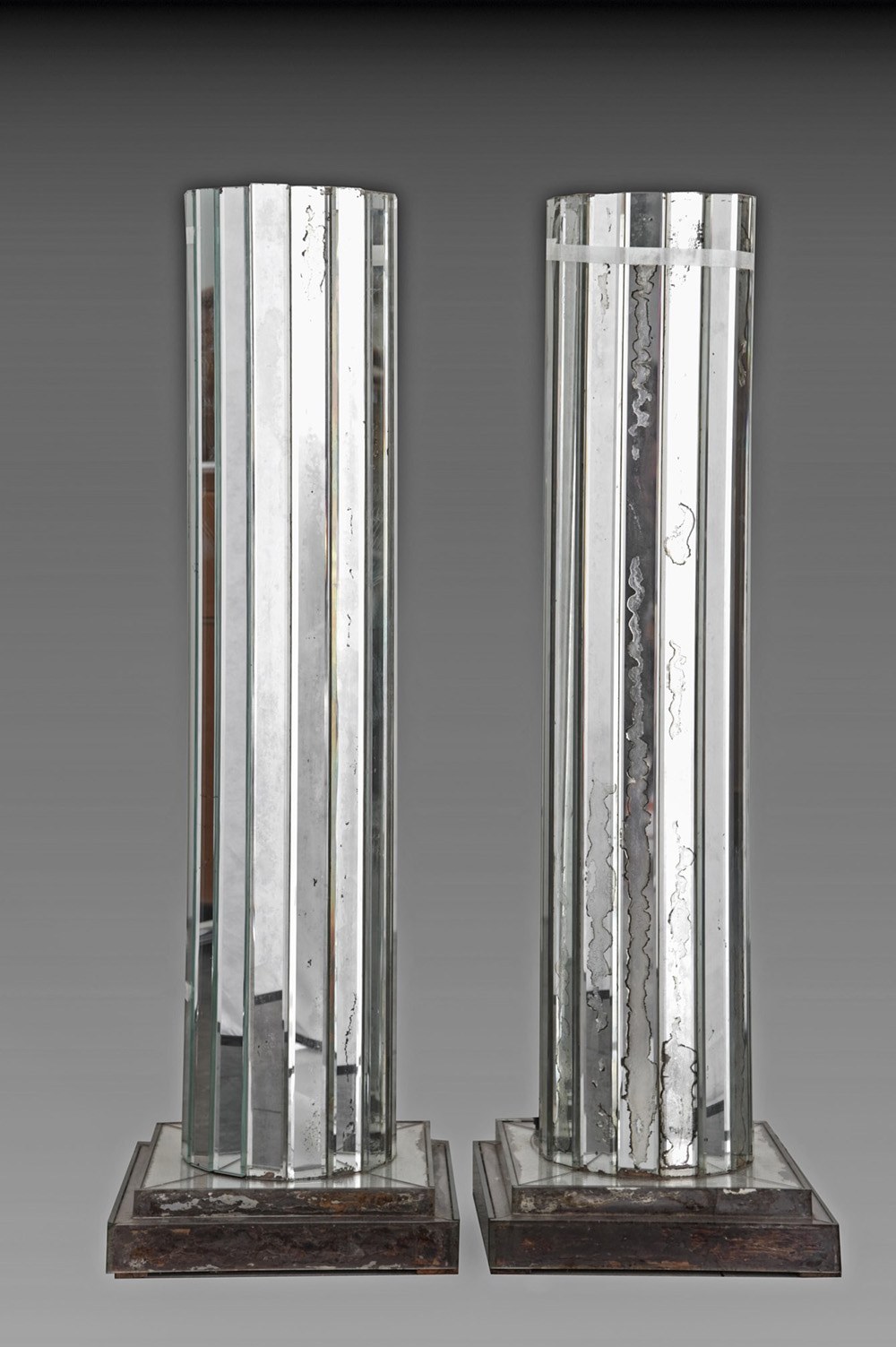 Coppia di piedistalli con base quadrata e fusto a sedici lati interamente rivestite in lastre di cristallo molato e specchiato. Piano superiore illuminato in lastra di vetro rosa. Esecuzione italiana anni '30 del sec. XX (h cm 122) (difetti)