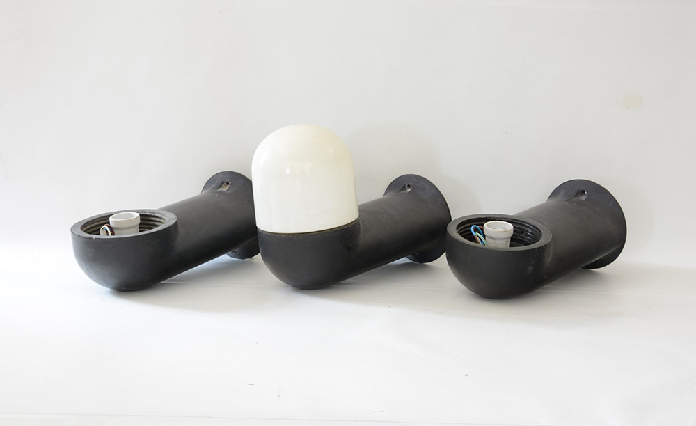 Sergio Mazza (1931- Lotto composto da tre appliques modello "Catilina" in fusione di alluminio pressofuso laccato nero e diffusori in vetro opalino. Produzione Artemide, Milano, anni 70 (l cm 35) (difetti e mancanze)