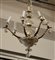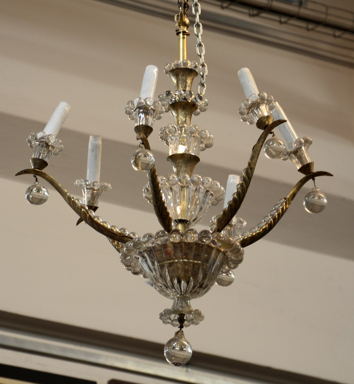 Lampadario a sei luci in vetro incolore e metallo argentato, composto da coppe a corpo costolato culminanti a corolle sferiche. Italia, sec XX (d cm 60 circa) (difetti)