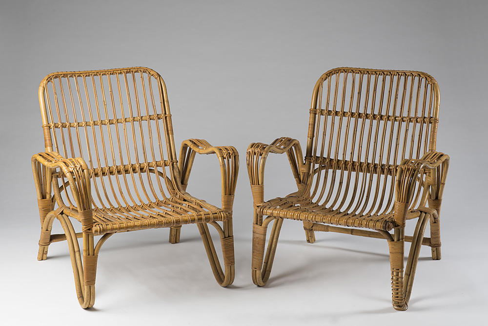 Coppia di poltroncine in vimini. Esecuzione Vittorio Bonacina, Lurago d'Erba, 1965 ca. Esemplare del 1970 (cm 69x80x74) (lievi difetti)
