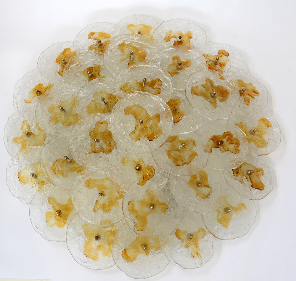 Manifattura di Murano ÅÅGrande applique con struttura in metallo laccato bianco e diffusori in vetro corrugato bianco e pagliesco. Anni 70 (d cm 74) (lievi difetti)