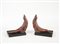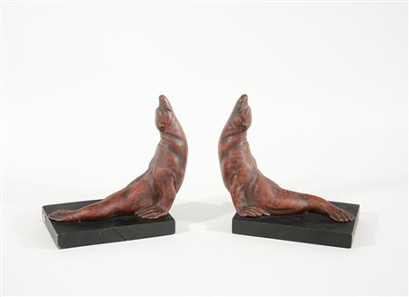 Bruno Merli (1914- ) Coppia di fermalibri a forma di foche in ceramica dipinta in rosso su basi in legno ebanizzato. Anni 30. Firmate in basso (h cm 20, l cm 21) (lievi difetti alle basi)