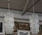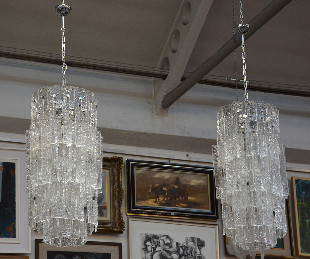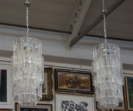 Coppia di lampadari in metallo cromato con pendenti a c in vetro corrugato....