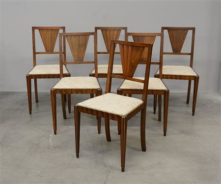 Lotto di sei sedie con struttura in noce scanalata secondo il gusto dÈco...