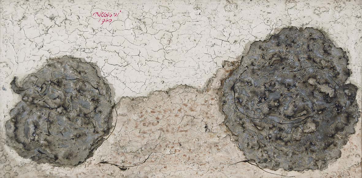 RACCAGNI ANDREA Imola 1921 - 2005 Natura Viva Con Zucche Grigie 1960 tecnica mista polimaterica su tavola Misure: 40x80 firma e data in alto a sinistra esposizioni Premio Repubblica di San Marino 1961 - etichetta al retro