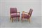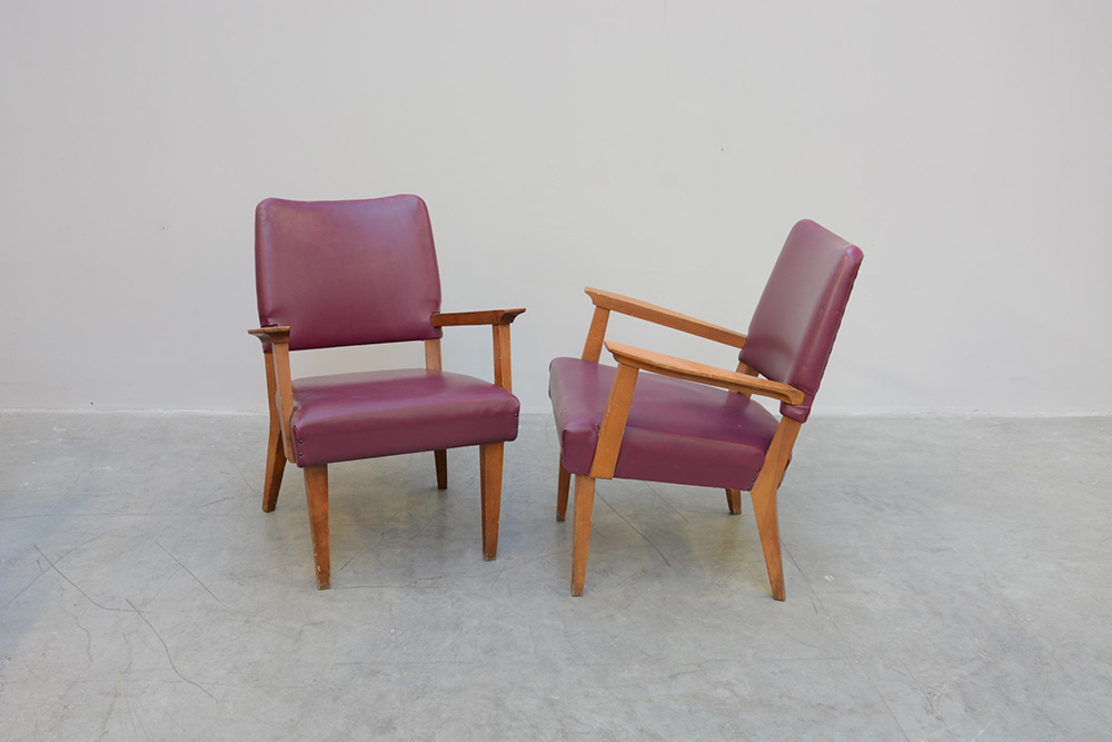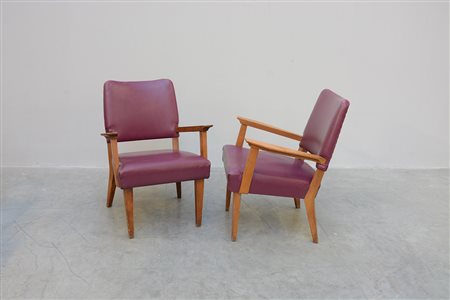 Coppia di poltroncine con braccioli in legno di noce massello e skai color bordeaux. Italia, sec XX (cm 66x82x60) (difetti)