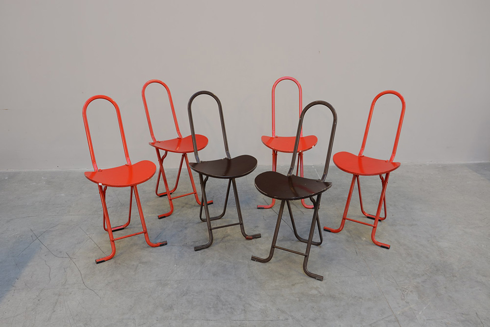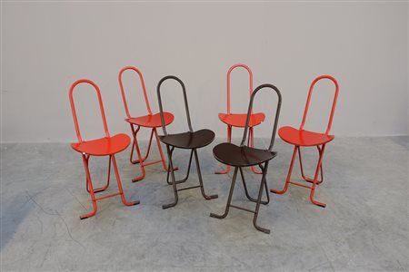 Gastone Rinaldi Padova (1920- 2006) Lotto composto da sei sedie modello "Dafne" in metallo laccato rosso e marrone. Produzione Thema, Padova, anni 70 (cm 36x78x45) (difetti) Bibliografia: M. Romanelli, M. laudani, Design Nordest, Abitare Segesta, Milano 1996, p. 47; G. Gramigna, G. Gramigna, Repertorio del design italiano 1950-2000 per l'arredamento domestico, vol. 1, Allemandi, Torino 2003, p. 264