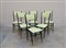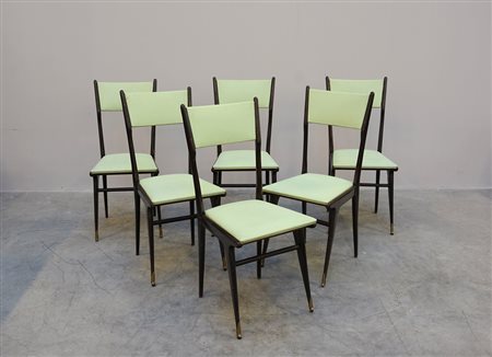 Lotto composto da sei sedie in legno con seduta e schienale in skai verde acqua. Italia, sec XX (difetti)