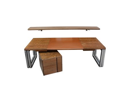Centro Progetti Tecno, Varedo, anni 70 Lotto composto da una scrivania modello "T 333" in alluminio pressofuso, legno e pelle (cm 253x70x110), unita a una cassettiera impiallacciata in legno (cm 59x55x59) e una mensola in alluminio pressofuso e legno (cm 298x5x45) (lievi difetti)