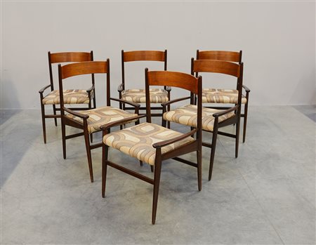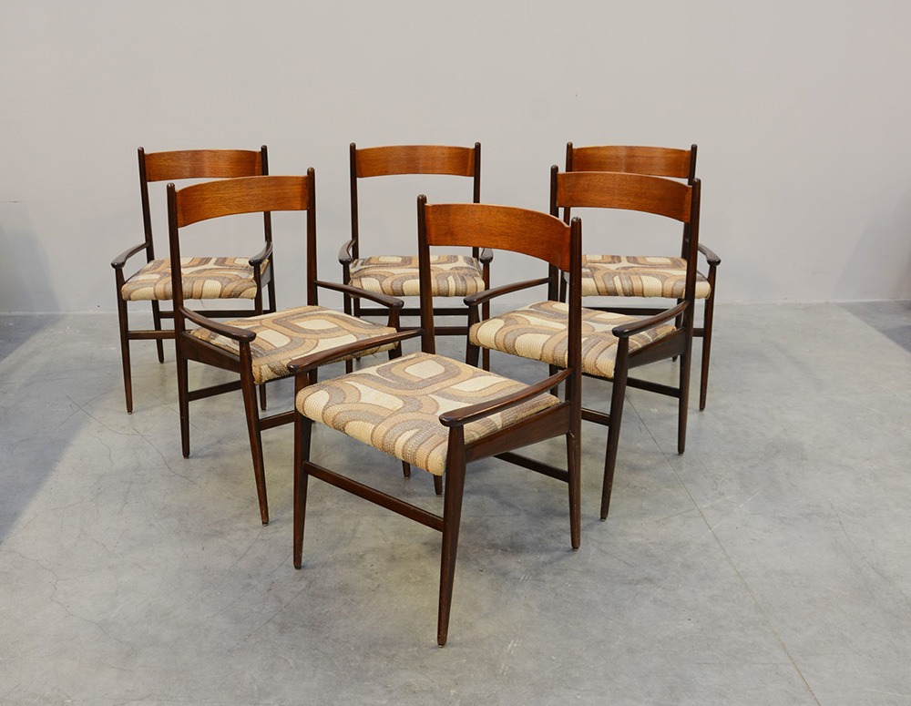 Lotto di sei sedie in legno massello con braccioli. Seduta sui toni del beige con decori astratti. Italia, anni 70 (difetti)
