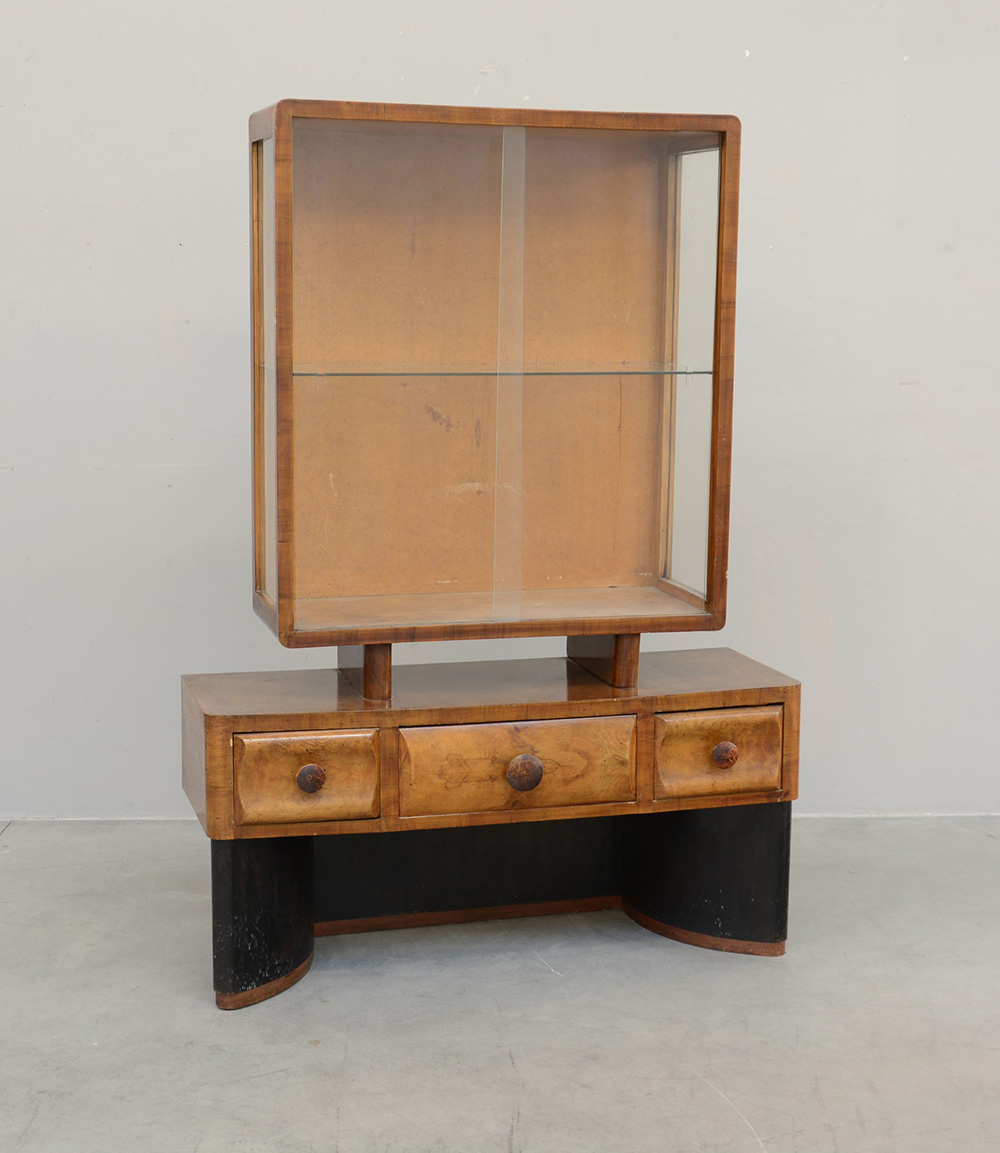 Vetrina DÈco impiallacciata in legno di noce e radica. Tre cassetti nella...