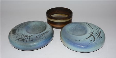Gabriella Locatelli Lotto composto da due svuota tasche in ceramica graffita e smaltata nei toni del grigio, ocra e celeste, unita a una ciotola cilindrica in gres bruno a fasce orizzontali. Milano II met‡ del sec XX. Monogramma sotto le basi (d cm 25 e d cm 18)