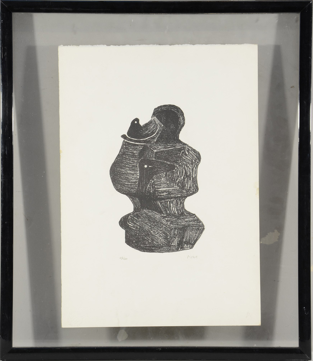Moore Henry. "Composizione" litografia (cm 52x36,5) firmata e numerata 48/100in basso, timbro a secco della Galleria D'Arte Cortina Cavour Milano. In cornice (lievi difetti)