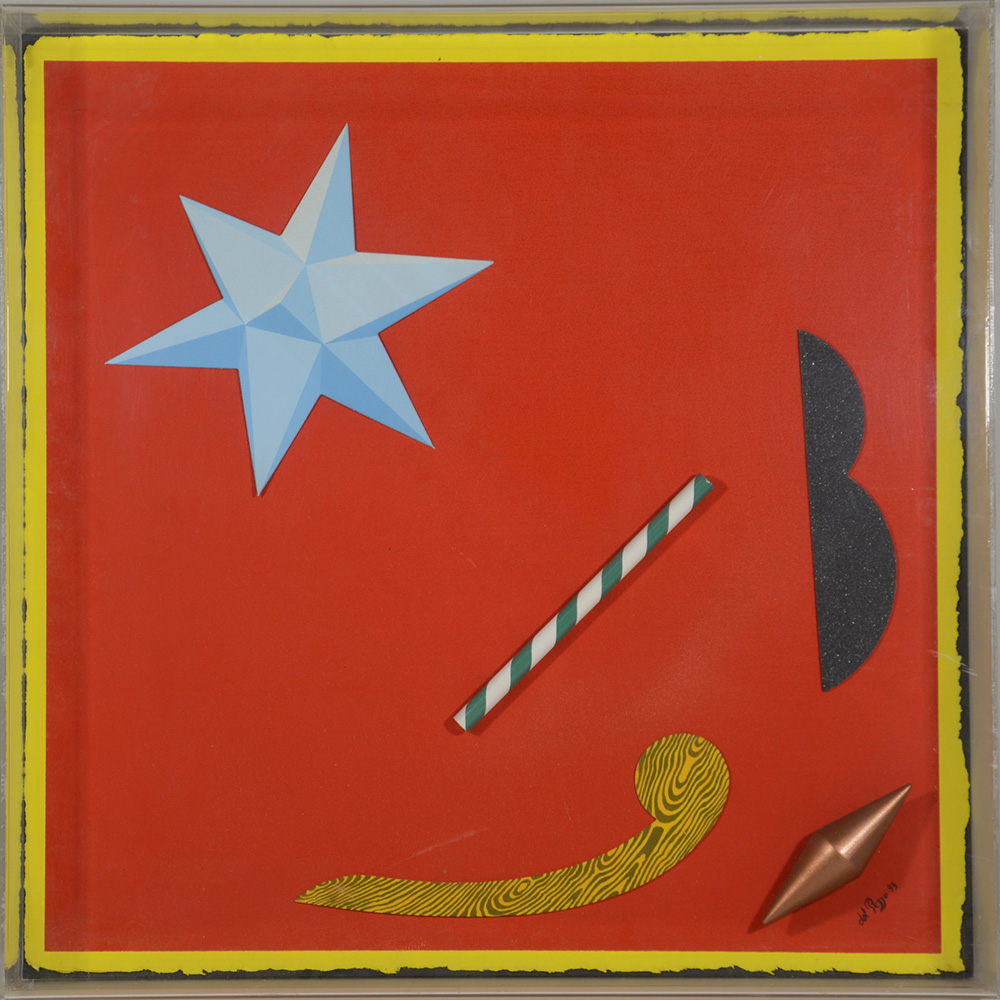 Del Pezzo "Composizione 93" tecnica mista, collage e assemblage su carta (cm 60x60) firmata e datata in basso a destra. In teca di plexiglass (lievi difetti)