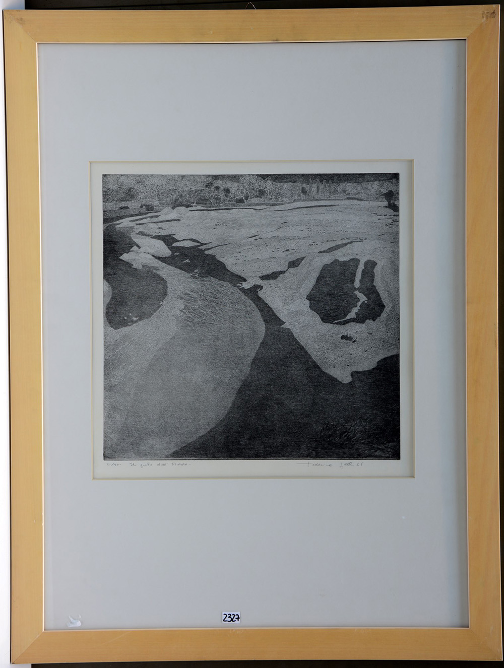 Galli Federica Soresina (1932- Milano 2009) "Il greto dell' Adda" 1966, acquaforte (cm 40x40 il foglio) esmplare 21/50, firmata, datata, numerata e titolata in basso. In cornice